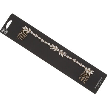 A special bridal accessory in the shape of a leaf stem to transform a look into one more luxurious and sophisticated. At 22cm, this headpiece is shaped around the head and attached into place with two combs at either end of piece. Light reflects off stones for eye-catching results.