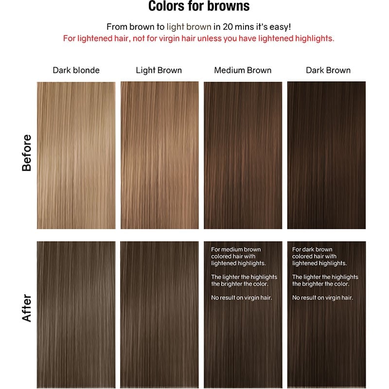 Maintain natural brown tones and/or correct brassy warm tones or gradually enrich color of grey virgin hair. Do not use on blonde hair, highlights or balayage.