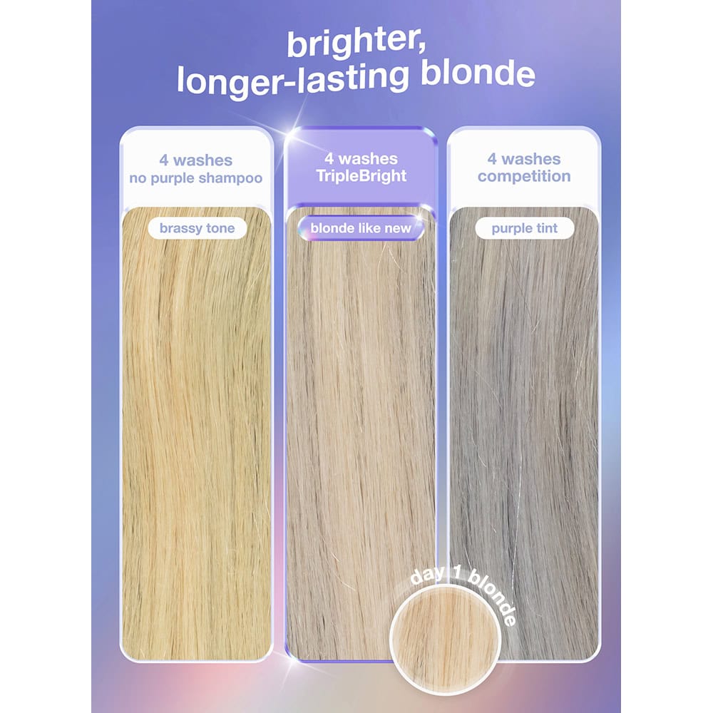TripleBright gives blondes tones the care they deserve. Thanks to triple-action technology, this purple foam shampoo has three distinct benefits for blondes: