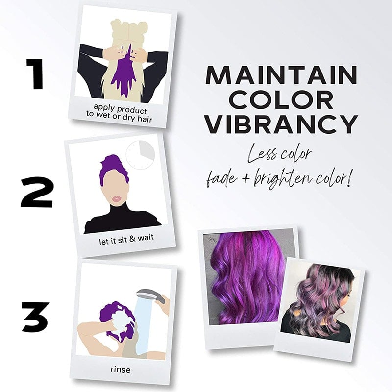 Transform your hair with a single wash. Use only on pre-lightened hair to a level 7 or higher. Wash with chosen color and step out to stunning color. Color lasts approximately 10-15 shampoos depending on hair porosity and chosen color. Vivid colors like blue will last longer than subtle shades like light pink.