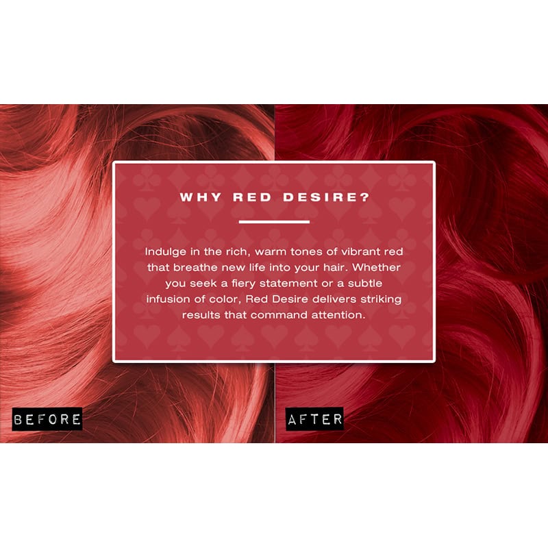 Red Desire is a classic and warm vibrant red for refreshing faded colour. Applying to virgin, unbleached hair impart hints of red. Complements Manic Panic Wildfire, Pillarbox Red and Rock ‘n Roll Red colours.