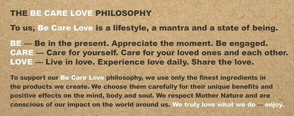 To support BLC’s “Be, Care, Love” philosophy, only the finest ingredients are used. They are chosen carefully for their benefits and effects on the mind, body and soul while taking care of the environment.